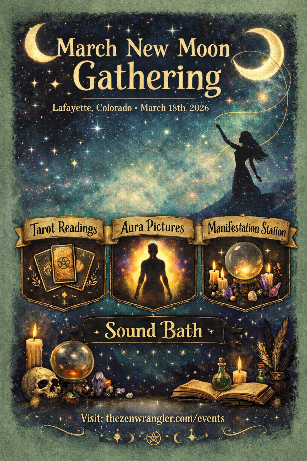 March New Moon Gathering 🍀🌚 an evening magic with The Zen Wrangler +Tarot Readings, Aura Pics, Manifestation Station + Sound Bath.